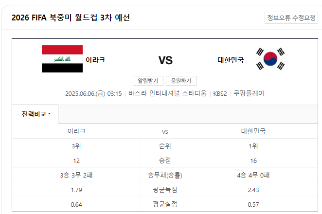 - 한국은 최근 이라크와의 3경기에서 모두 승리 중