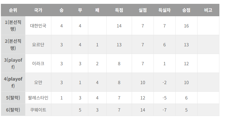 | 2 | 요르단 | 13 | 3 | 4 | 1 | +4 |